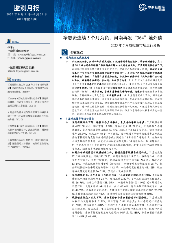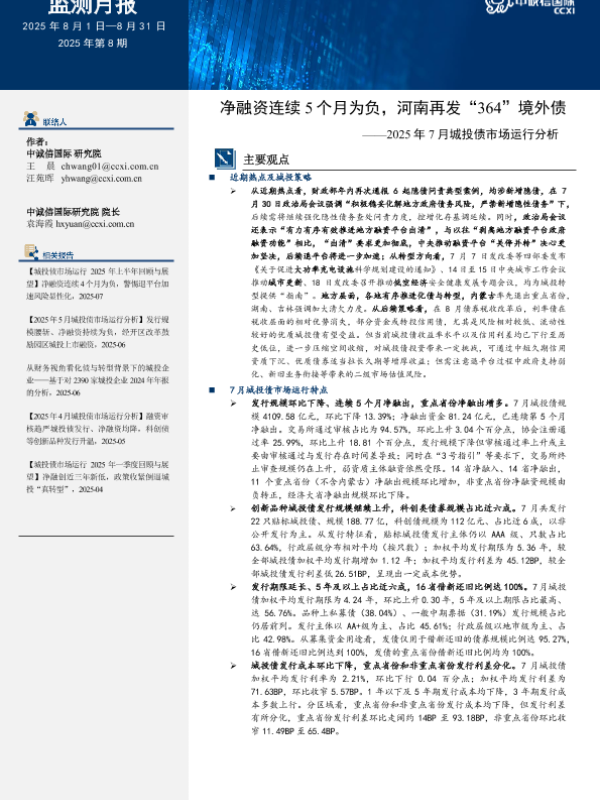 【中诚信国际】【202507】净融资连续5个月为负,河南再发“364”境外债——2025年7月城投债市场运行分析-19页