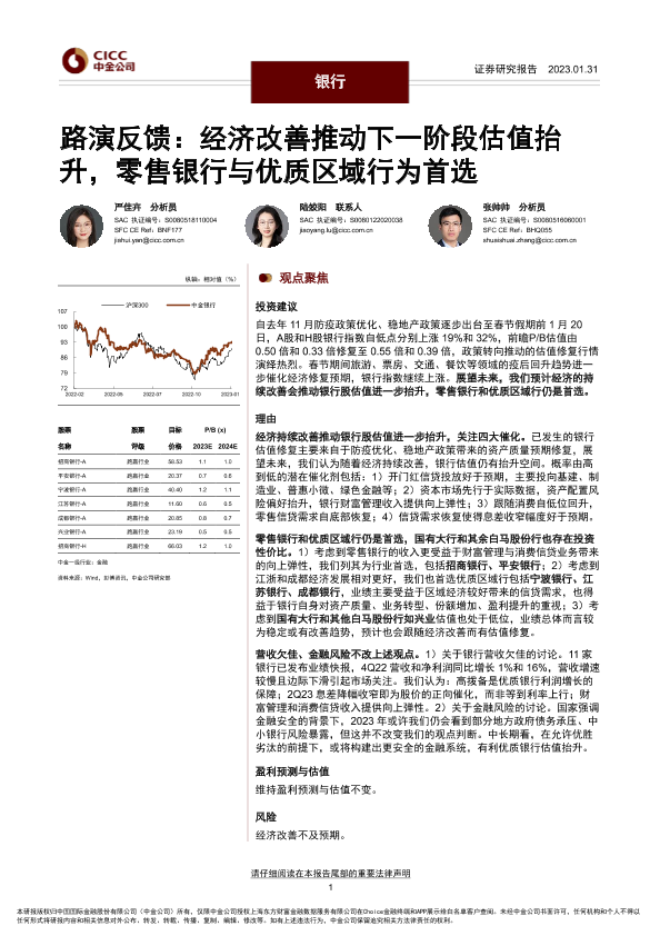 【中金公司】【20230131】银行路演反馈:经济改善推动下一阶段估值抬升,零售银行与优质区域行为首选-17页