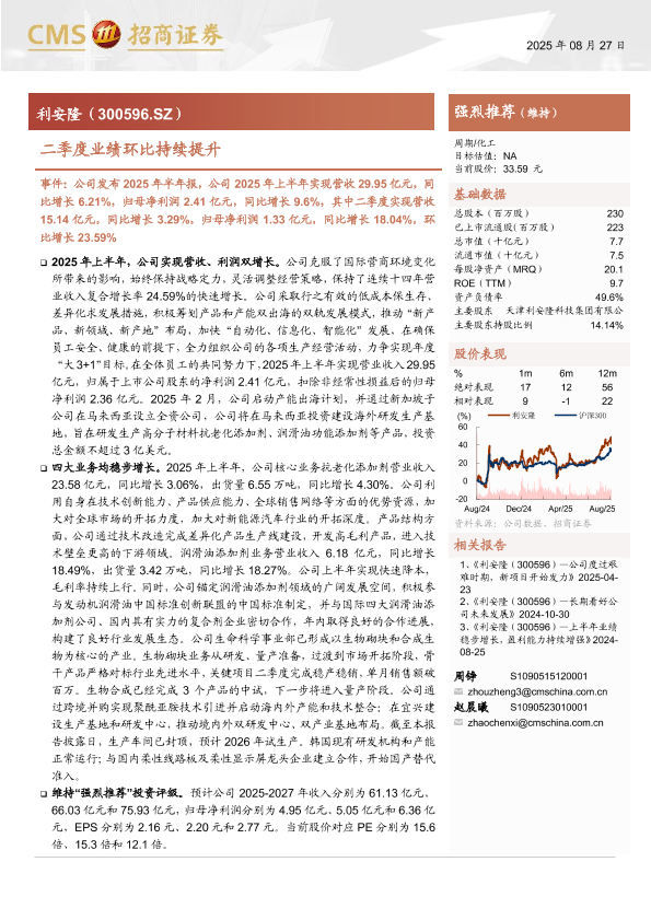 【海通证券】【202508】利安隆(300596)——二季度业绩环比持续提升-16页
