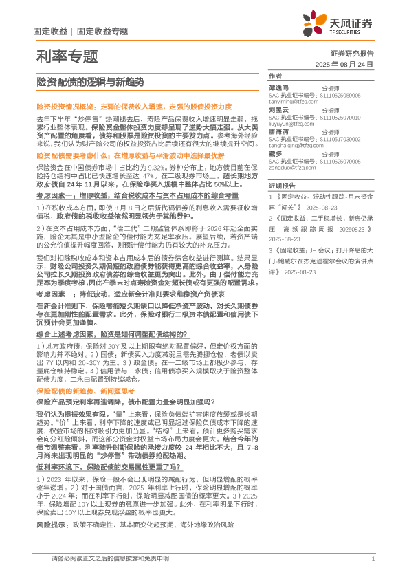 【天风证券】【202508】利率专题:险资配债的逻辑与新趋势-24页