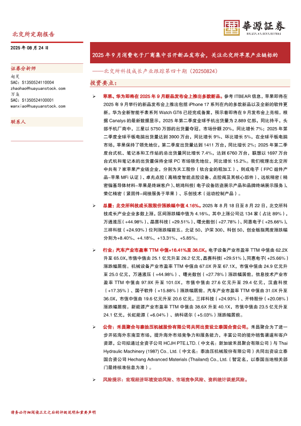 新品发布 北交所 苹果产业链 消费电子 行业研究