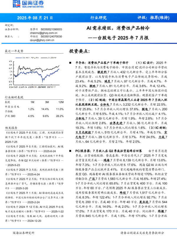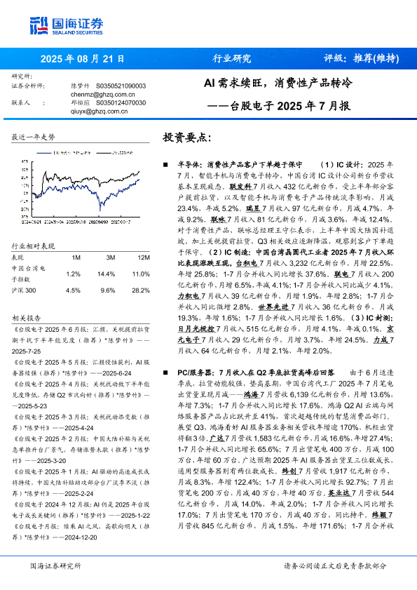 【国海证券】【202508】AI需求续旺,消费性产品转冷——台股电子 2025年 7月报-12页