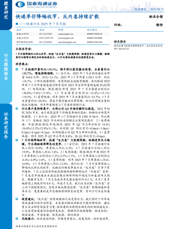 【国泰海通证券】【202507】快递价格降幅收窄,反内卷促良性竞争-12页