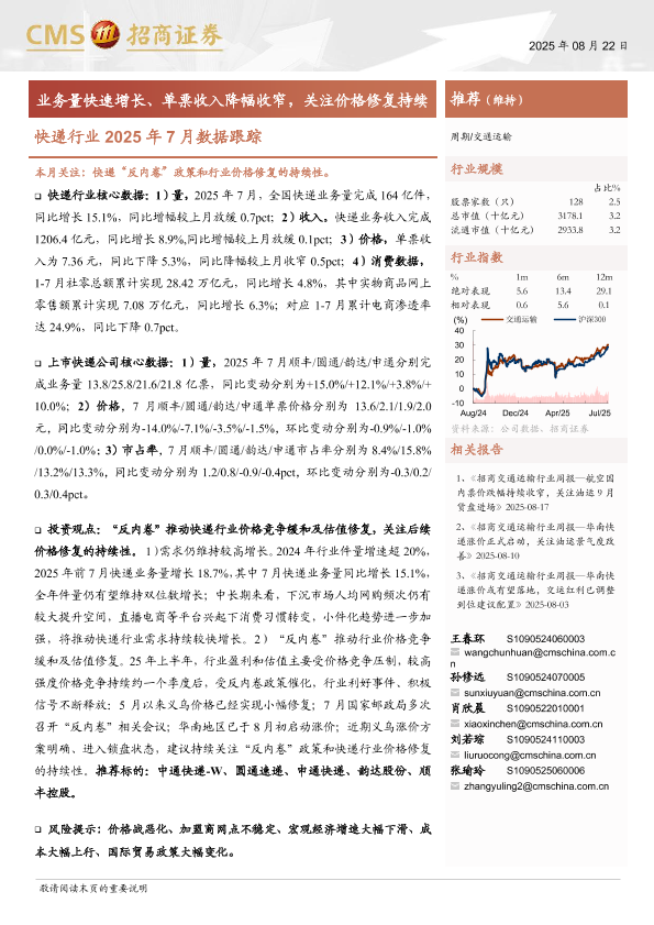 【海通证券】【202508】快递行业2025年7月数据跟踪:业务量快速增长、单票收入降幅收窄,关注价格修复持续性-13页