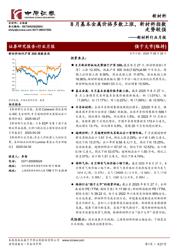 【中原证券】【202508】新材料行业月报:8月基本金属价格多数上涨,新材料指数走势较强-21页