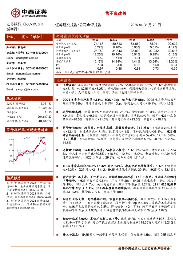 【中泰证券】【202508】详解江苏银行2025年半年报:营收增速回升,存贷持续高增,零售不良改善-10页