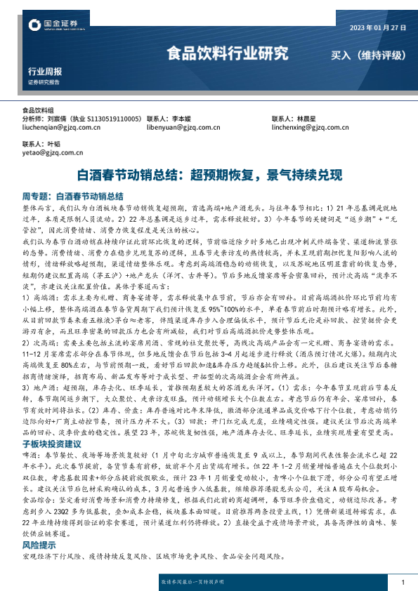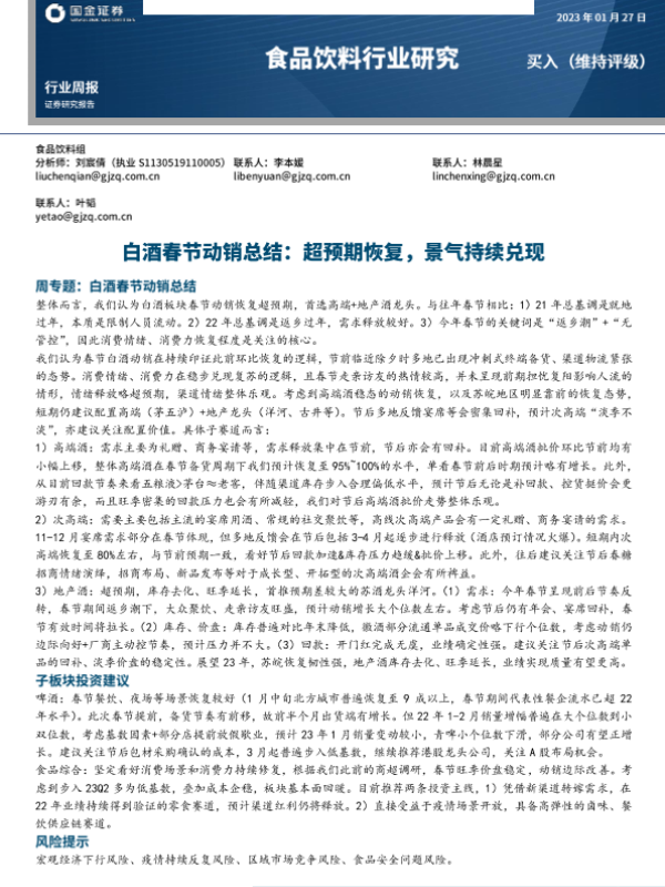 【国金证券】【20230127】食品饮料行业周报:白酒春节动销总结,超预期恢复,景气持续兑现-15页