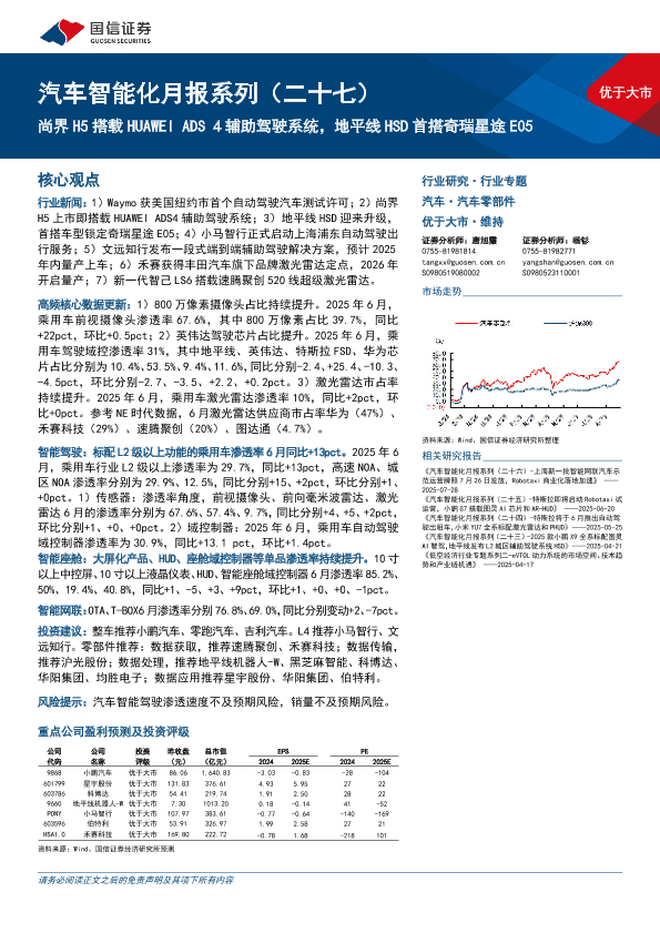 【国信证券】【202508】汽车智能化月报系列(二十七):尚界H5搭载HUAWEI+ADS+4辅助驾驶系统,地平线HSD首搭奇瑞星途E05-63页