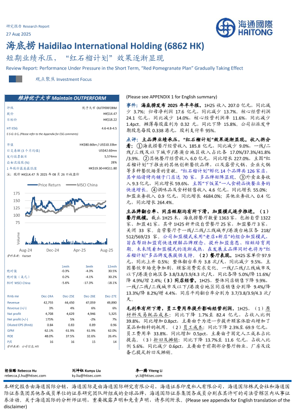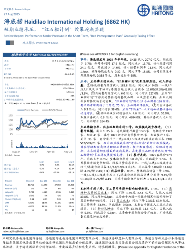 【海通国际】【202508】海底捞 Haidilao International Holding(6862 HK) 短期业绩承压,“红石榴计划”效果逐渐显现-12页
