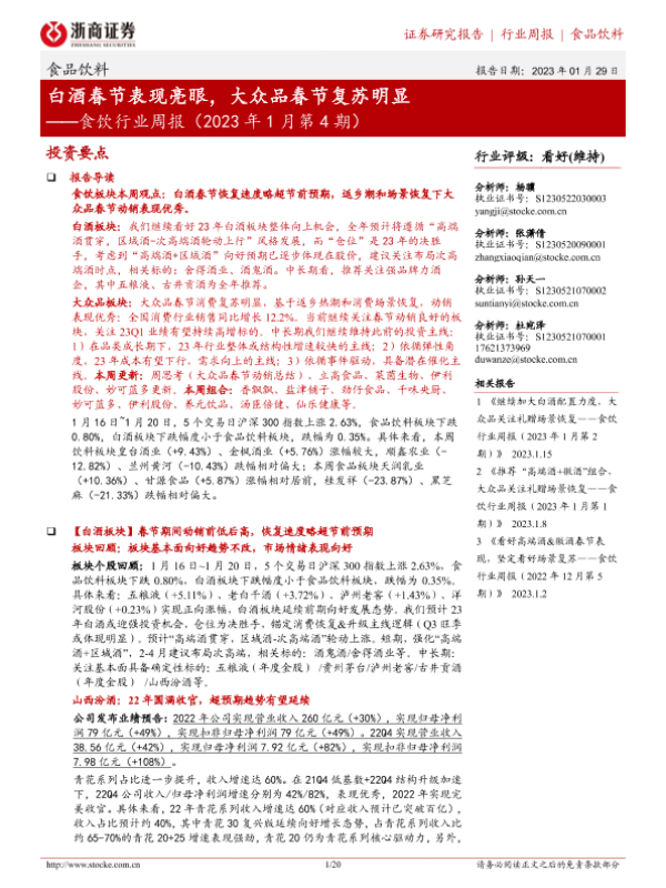 【浙商证券】【20230129】食饮行业周报(2023年1月第4期):白酒春节表现亮眼,大众品春节复苏明显-20页