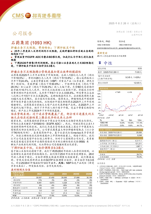 【招商证券国际】【202508】CSPC PHARMA ( 1093 HK ) - Learn from oncology miss and wait for a turnaround; D/G to HOLD-15页