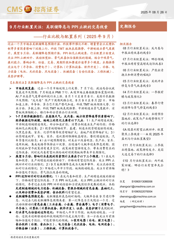 【海通证券】【202508】行业比较与配置系列(2025年9月):9月行业配置关注,美联储降息与PPI止跌的交易线索-40页