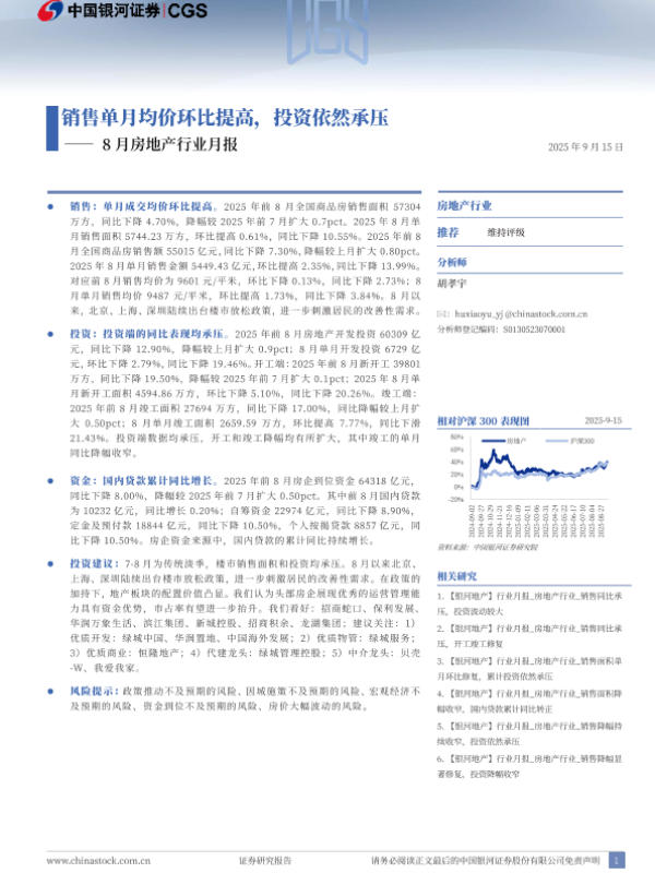 【银河证券】【202509】8月房地产行业月报:销售单月均价环比提高,投资依然承压-11页