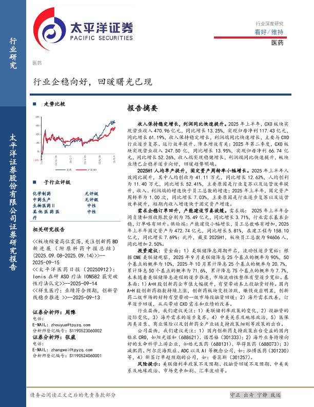 医药行业 行业复苏 业绩增长 CXO 投资建议