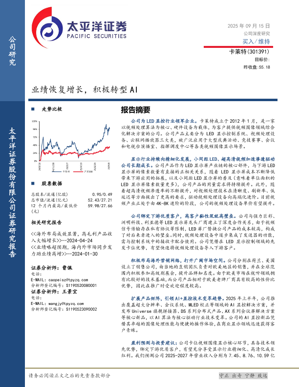 【太平洋证券】【202509】卡莱特(301391)业绩恢复增长,积极转型AI-27页