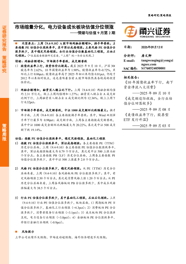 【甬兴证券】【202509】情绪与估值9月第2期:市场缩量分化,电力设备成长板块估值分位领涨-11页