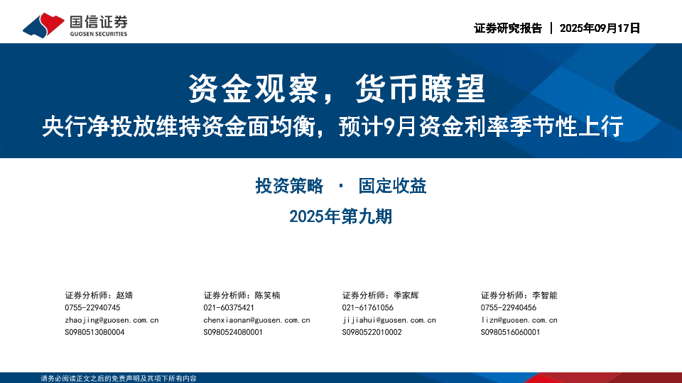 【国信证券】【202509】投资策略·固定收益2025年第九期:资金观察,货币瞭望,央行净投放维持资金面均衡,预计9月资金利率季节性上行-28页