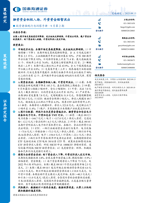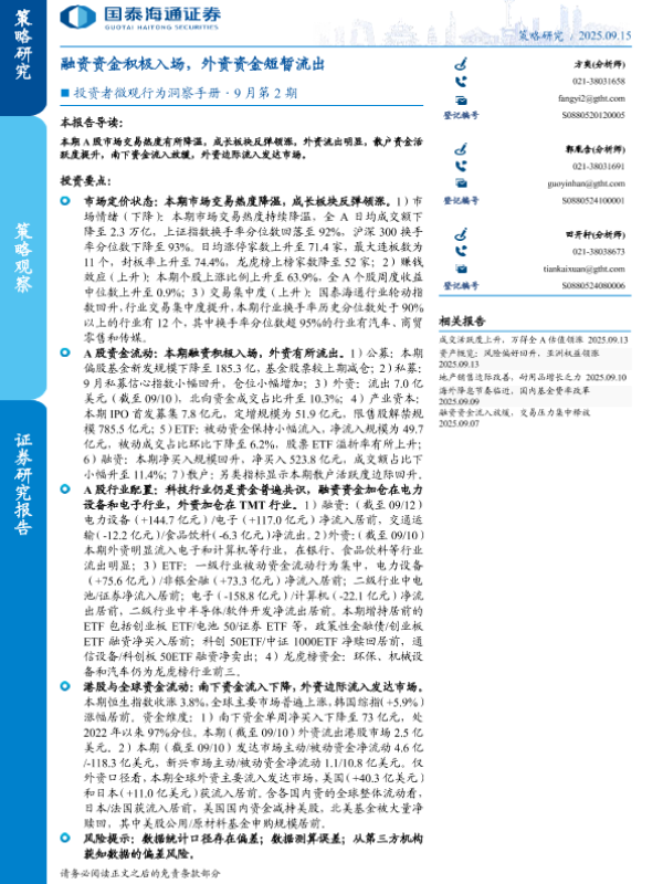 【国泰海通证券】【202509】投资者微观行为洞察手册·9月第2期:融资资金积极入场,外资资金短暂流出-32页
