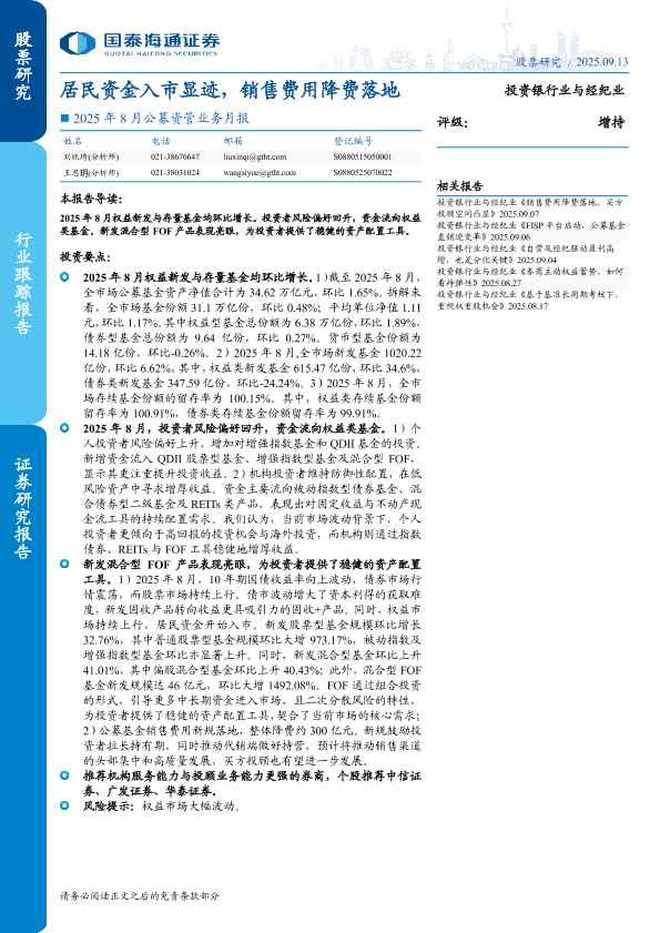 【国泰海通证券】【202509】投资银行业与经纪业行业2025年8月公募资管业务月报:居民资金入市显迹,销售费用降费落地-11页