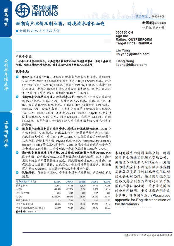 【海通国际】【202509】新国都(300130)2025年半年报点评:短期商户拓新压制业绩,跨境流水增长加速-11页
