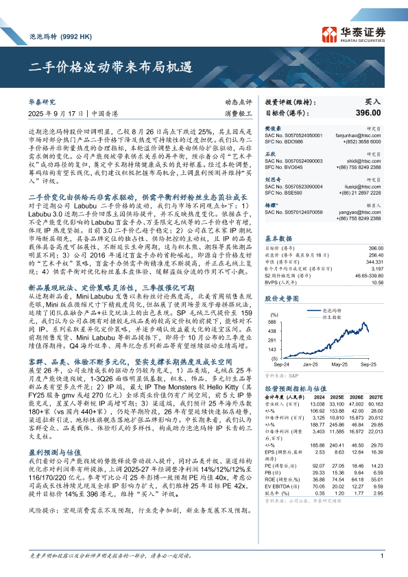 投资评级 潮玩 泡泡玛特 二手价格 IP运营