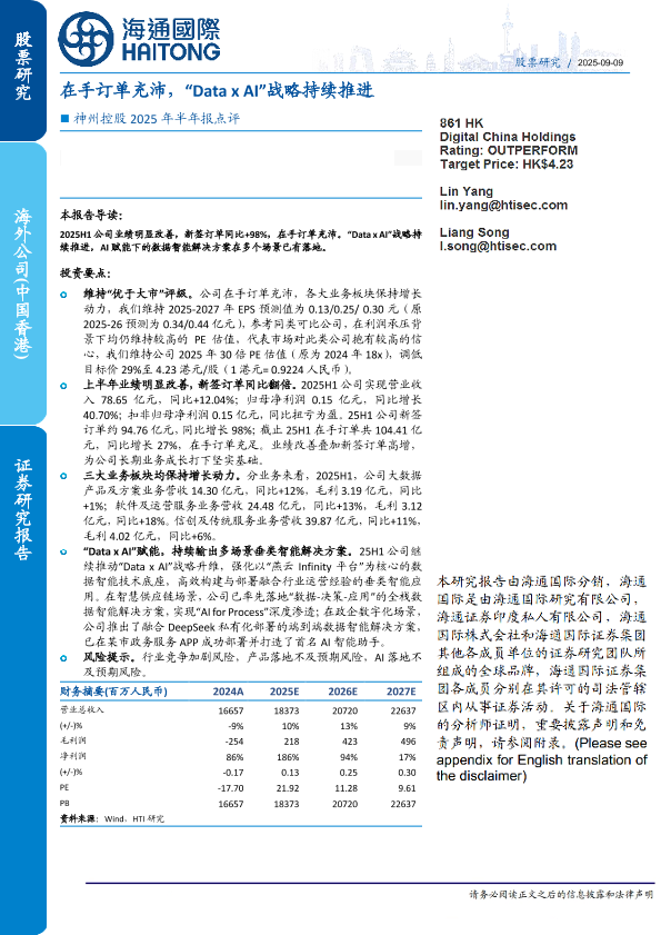【海通国际】【202509】神州控股2025年半年报点评:在手订单充沛,“Data x AI”战略持续推进-11页