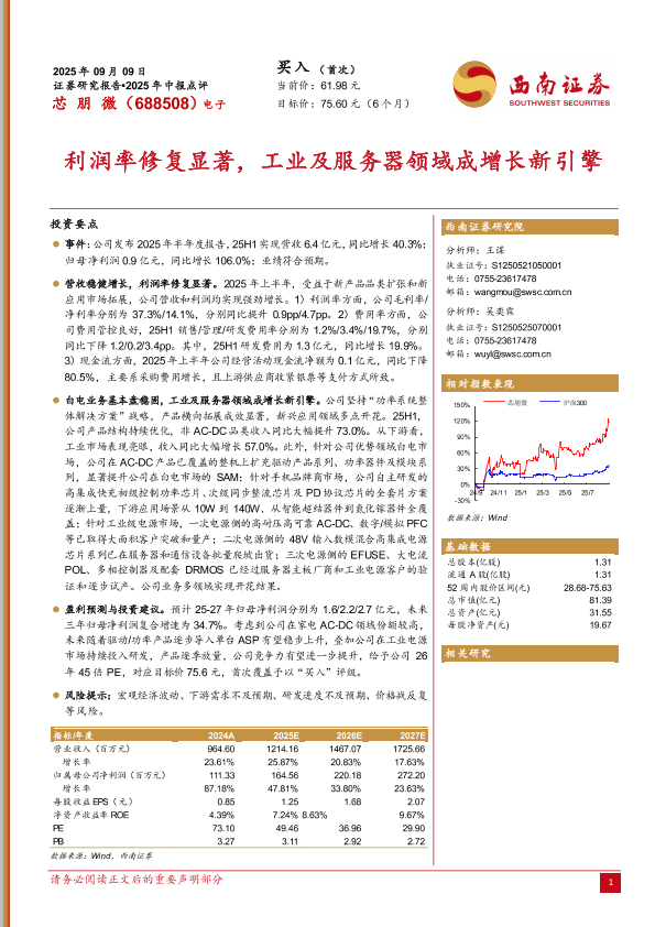 【西南证券】【202509】芯朋微(688508)2025年中报点评:利润率修复显著,工业及服务器领域成增长新引擎-10页