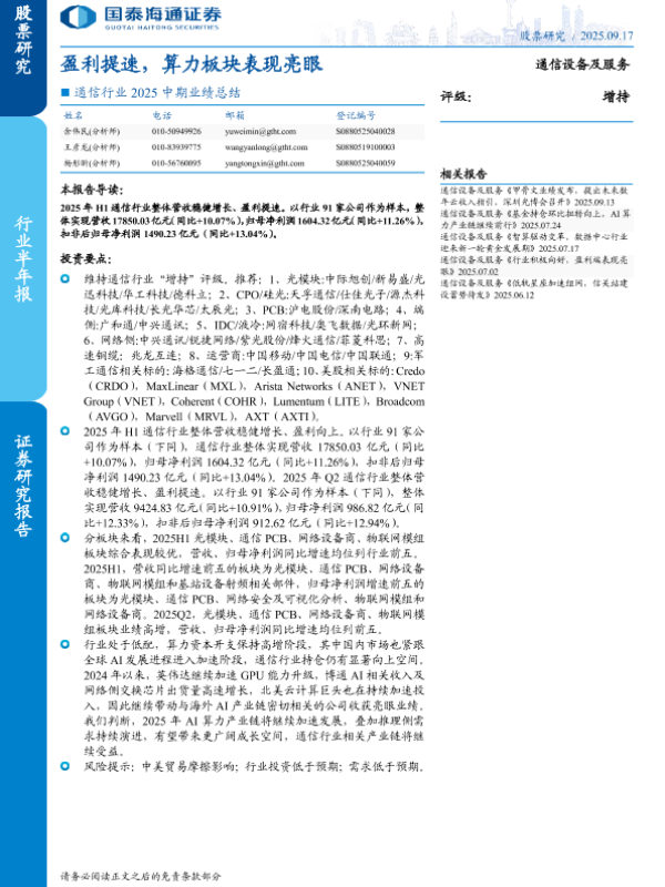 【国泰海通证券】【202509】通信行业2025中期业绩总结:盈利提速,算力板块表现亮眼-21页
