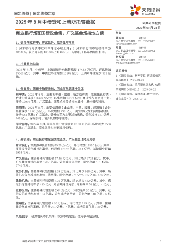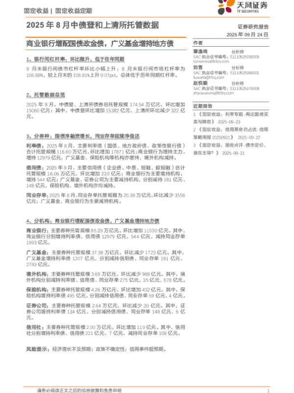 【天风证券】【202509】2025年8月中债登和上清所托管数据:商业银行增配国债政金债,广义基金增持地方债-11页