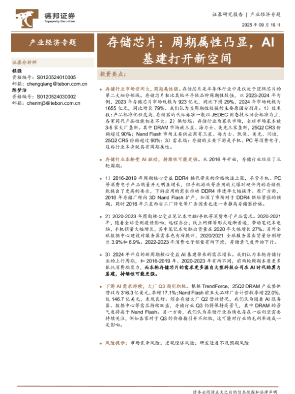 【德邦证券】【202509】存储芯片,周期属性凸显,AI基建打开新空间-10页