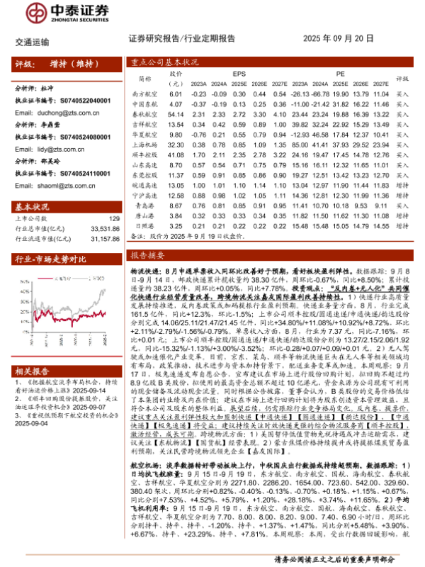 【中泰证券】【202509】快递业绩弹性释放可期,航空低位持续提示机会-24页