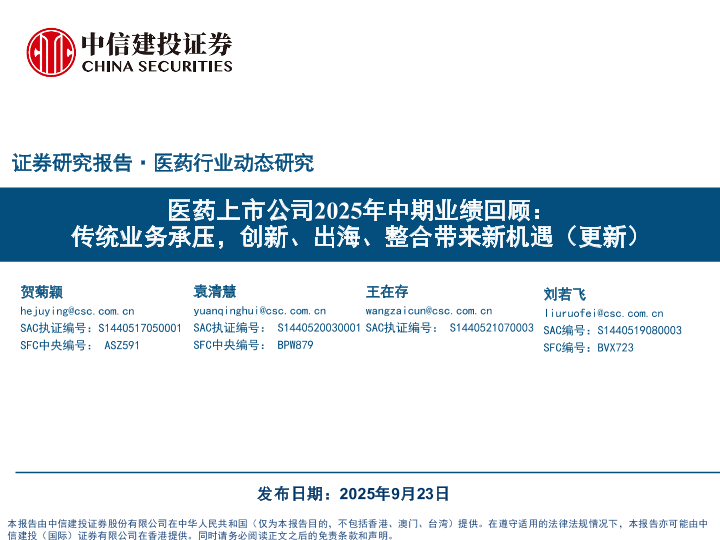 【中信建投证券】【202509】医药行业上市公司2025年中期业绩回顾:传统业务承压,创新、出海、整合带来新机遇(更新)-115页