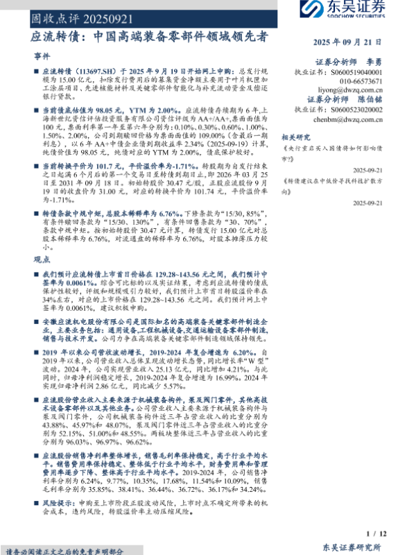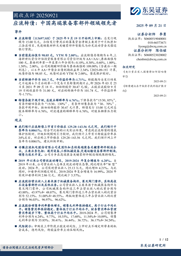 【东吴证券】【202509】固收点评:应流转债,中国高端装备零部件领域领先者-12页