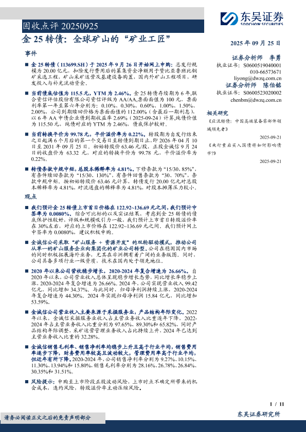 【东吴证券】【202509】固收点评:金25转债,全球矿山的“矿业工匠”-11页