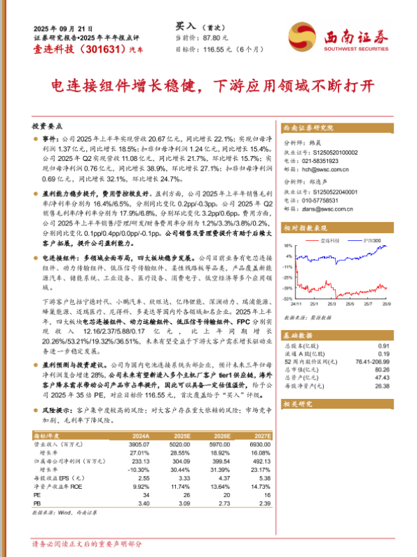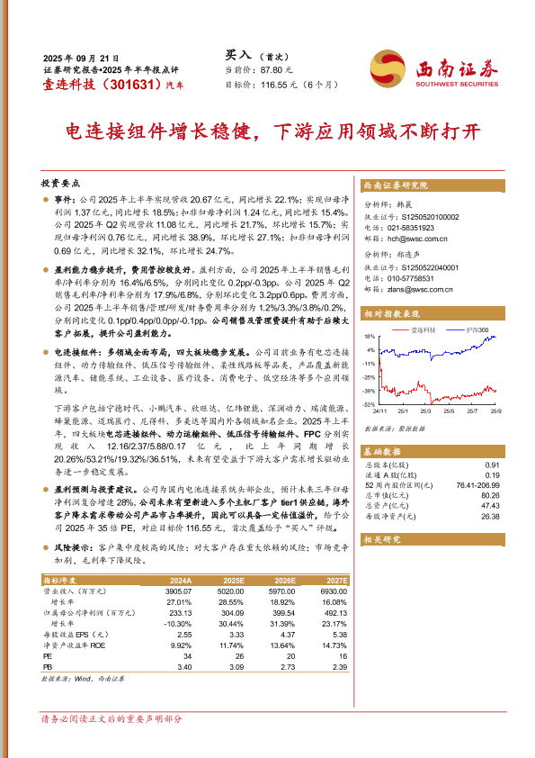 【西南证券】【202509】壹连科技(301631)2025年半年报点评:电连接组件增长稳健,下游应用领域不断打开-17页