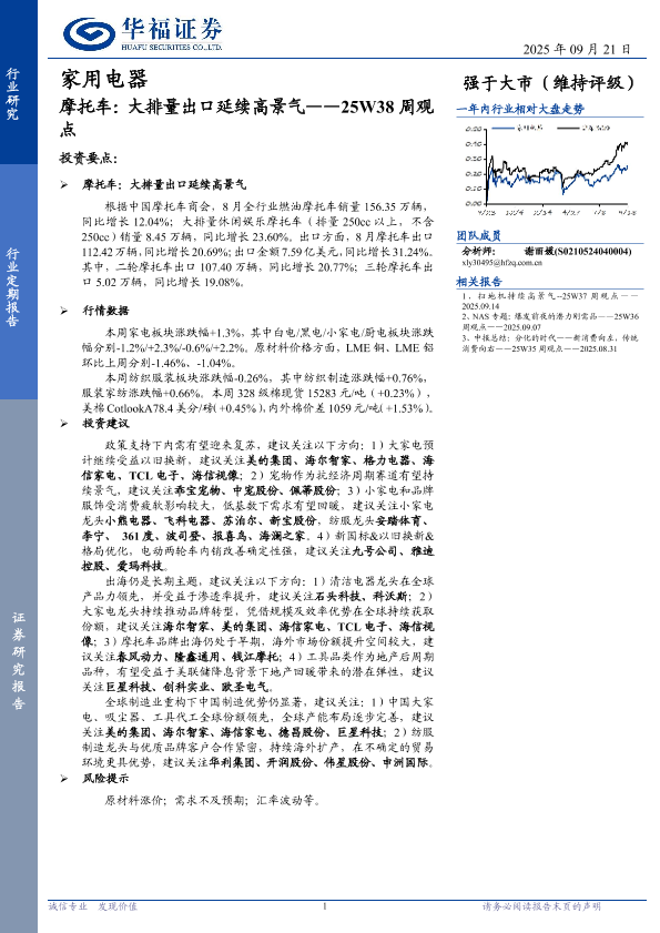 【华福证券】【202509】家用电器:摩托车:大排量出口延续高景气——25W38周观点-16页