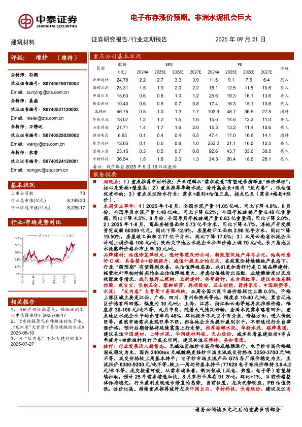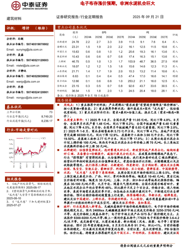 【中泰证券】【202509】建筑材料-电子布存涨价预期,非洲水泥机会巨大-19页