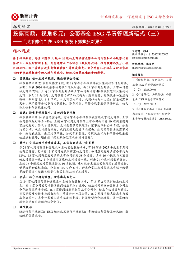 【浙商证券】【202509】投票高频,视角多元:公募基金 ESG尽责管理新范式(三)——“贝莱德们”在 A&H股投下哪些反对票?-13页
