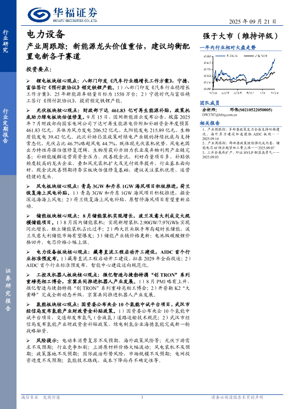 【华福证券】【202509】电力设备行业定期报告:产业周跟踪,新能源龙头价值重估,建议均衡配置电新各子赛道-20页