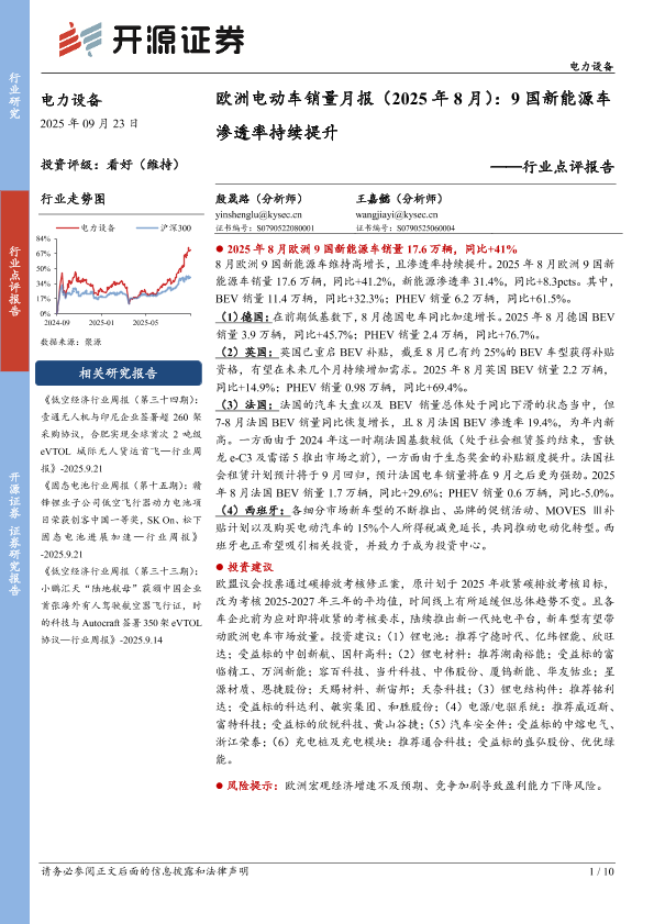 【开源证券】【202509】电力设备行业点评报告-欧洲电动车销量月报(2025年8月):9国新能源车渗透率持续提升-10页