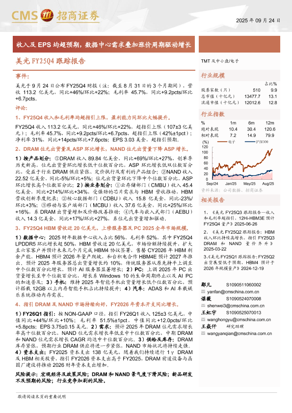 【海通证券】【202509】美光FY25Q4跟踪报告:收入及EPS均超预期,数据中心需求叠加涨价周期驱动增长-18页