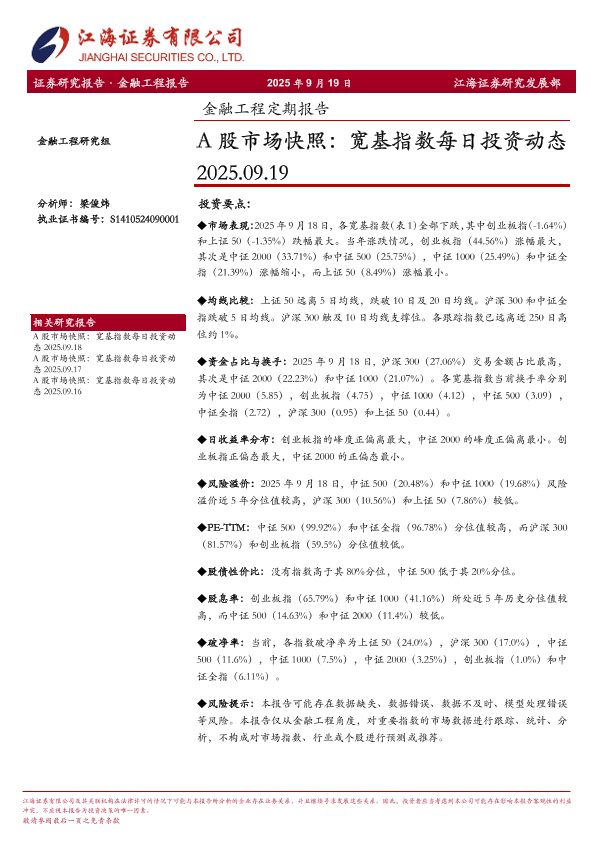 【江海证券】【202509】金融工程定期报告:A股市场快照,宽基指数每日投资动态-250919-13页