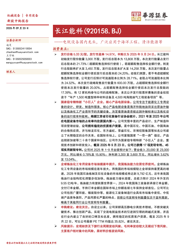 【华源证券】【202509】长江能科(920158)电脱设备国内龙头,广泛应用于海洋工程、清洁能源等-19页