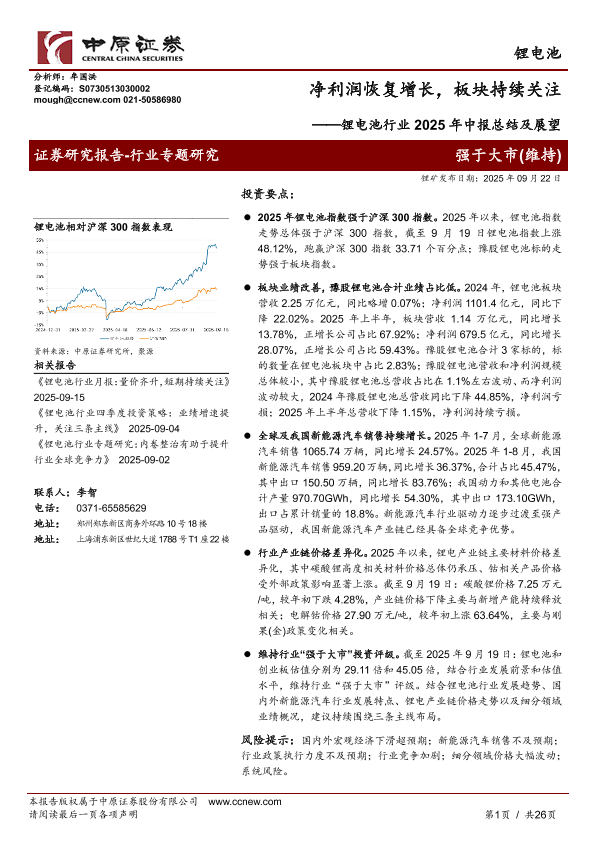 【中原证券】【202509】锂电池行业2025年中报总结及展望:净利润恢复增长,板块持续关注-26页