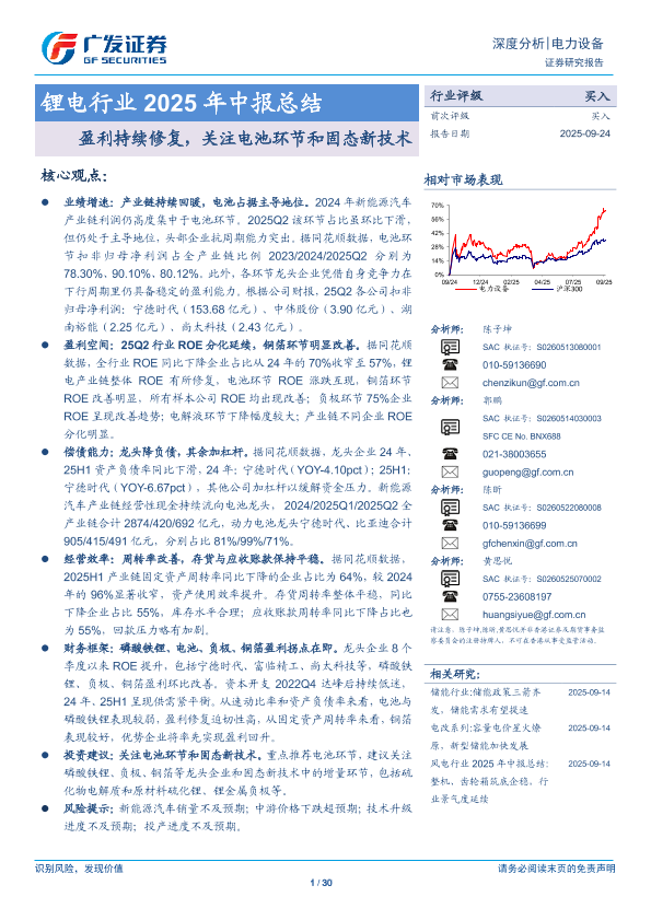 【广发证券】【202509】锂电行业2025年中报总结:盈利持续修复,关注电池环节和固态新技术-30页