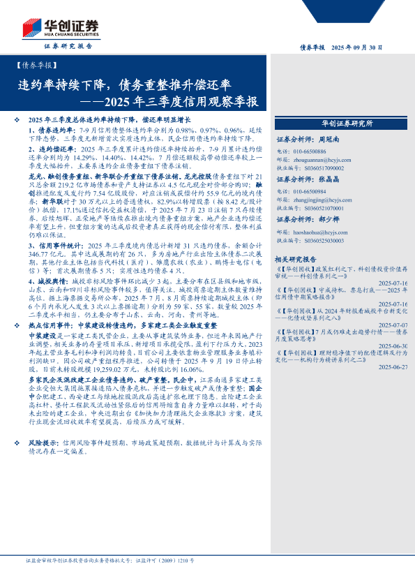 【华创证券】【202509】违约率持续下降,债务重整推升偿还率——2025年三季度信用观察季报-16页