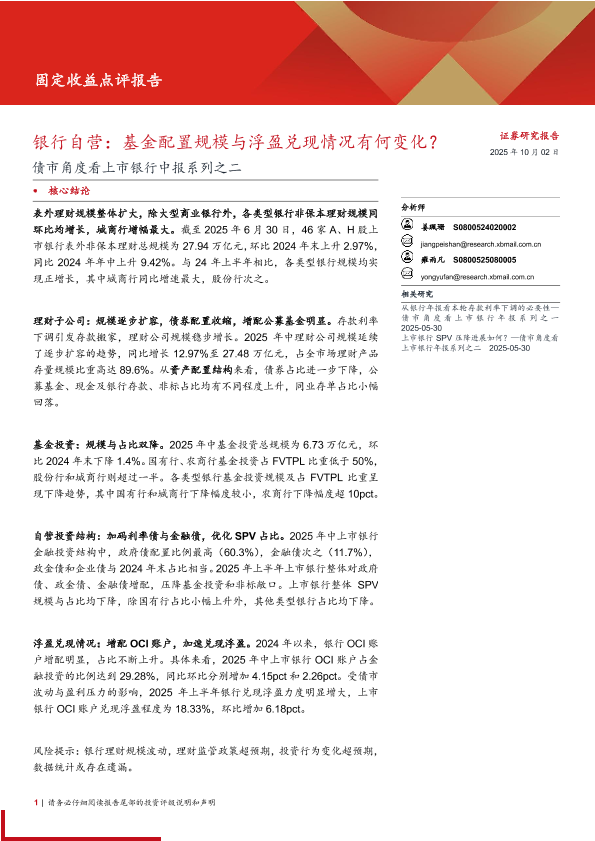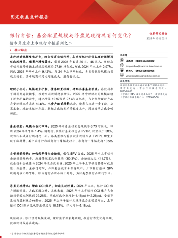 【西部证券】【202510】债市角度看上市银行中报系列之二:银行自营,基金配置规模与浮盈兑现情况有何变化?-14页
