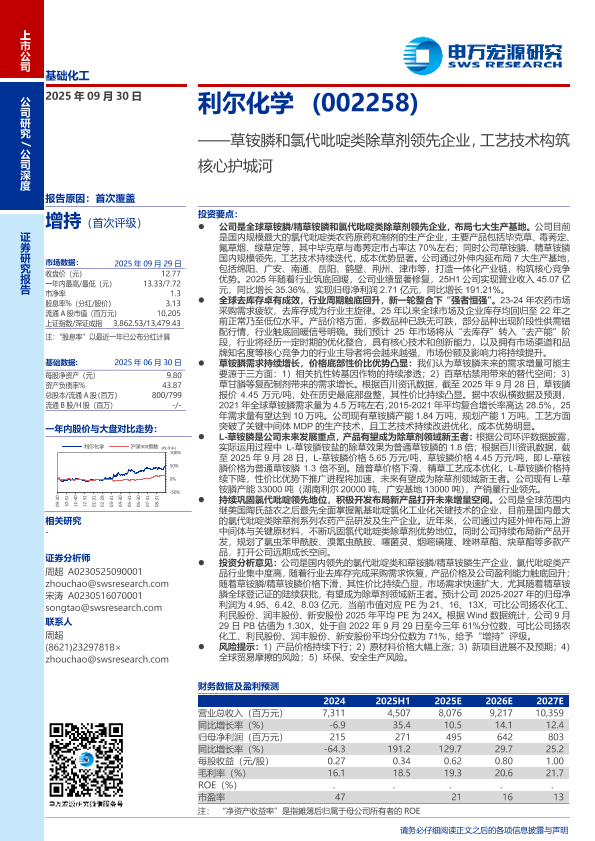 【申万宏源】【202509】利尔化学:草铵膦和氯代吡啶类除草剂领先企业,工艺技术构筑核心护城河-41页