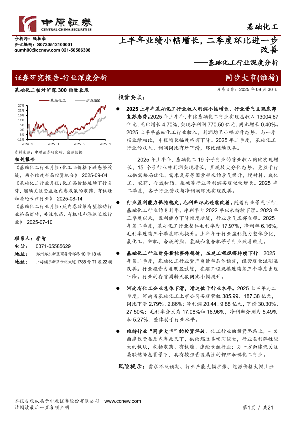 【中原证券】【202509】基础化工行业深度分析:上半年业绩小幅增长,二季度环比进一步改善-21页