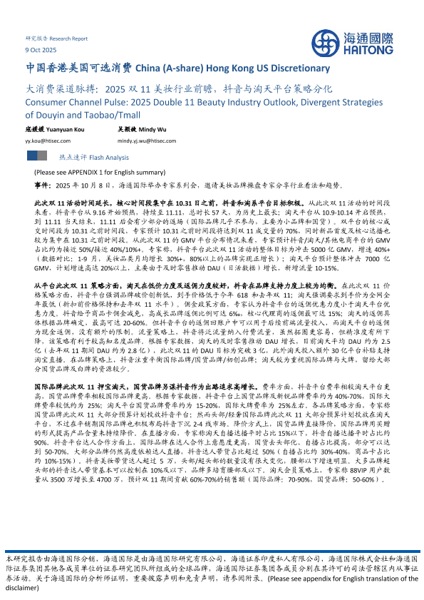 【海通国际】【202510】大消费渠道脉搏:2025双11美妆行业前瞻,抖音与淘天平台策略分化-10页